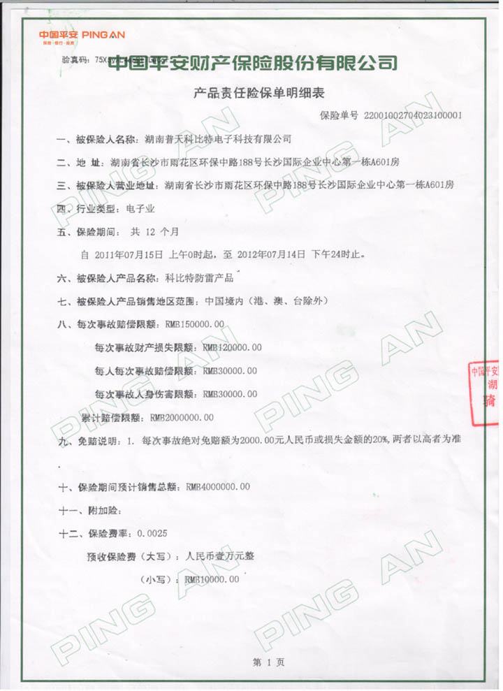 中國平安保險質量全程承保防雷產品